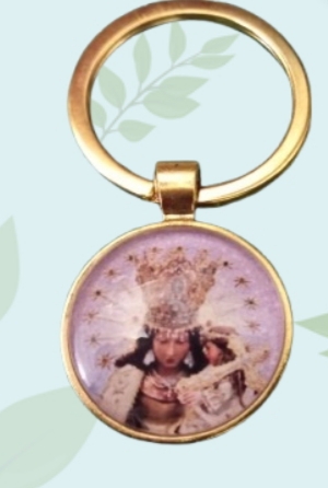 Llavero dorado con la imagen de la Virgen de los Desamparados.