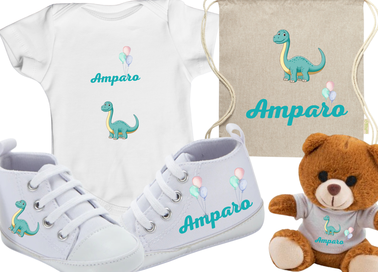 Este adorable lote personalizado incluye todo lo necesario para acompañar los primeros pasos y aventuras de tu bebé, con un diseño tierno de dinosaurio y globitos en tono pastel.